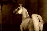 Portrait of a beautiful gray arabian horse looks back on natural background, head closeup