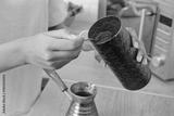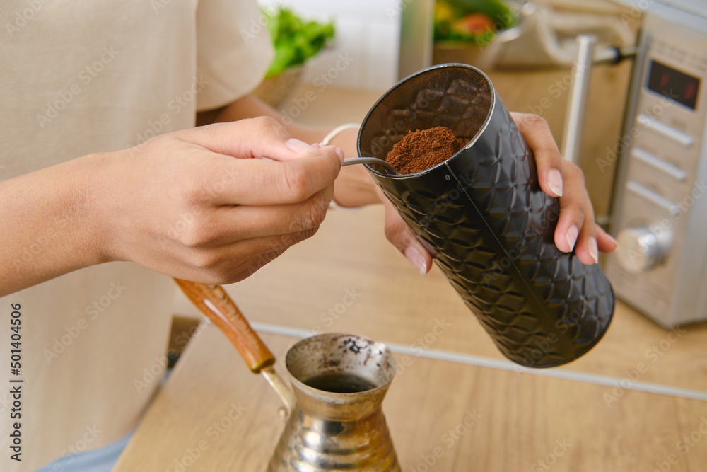Closeup view of making ground coffee at home in turkish cezve