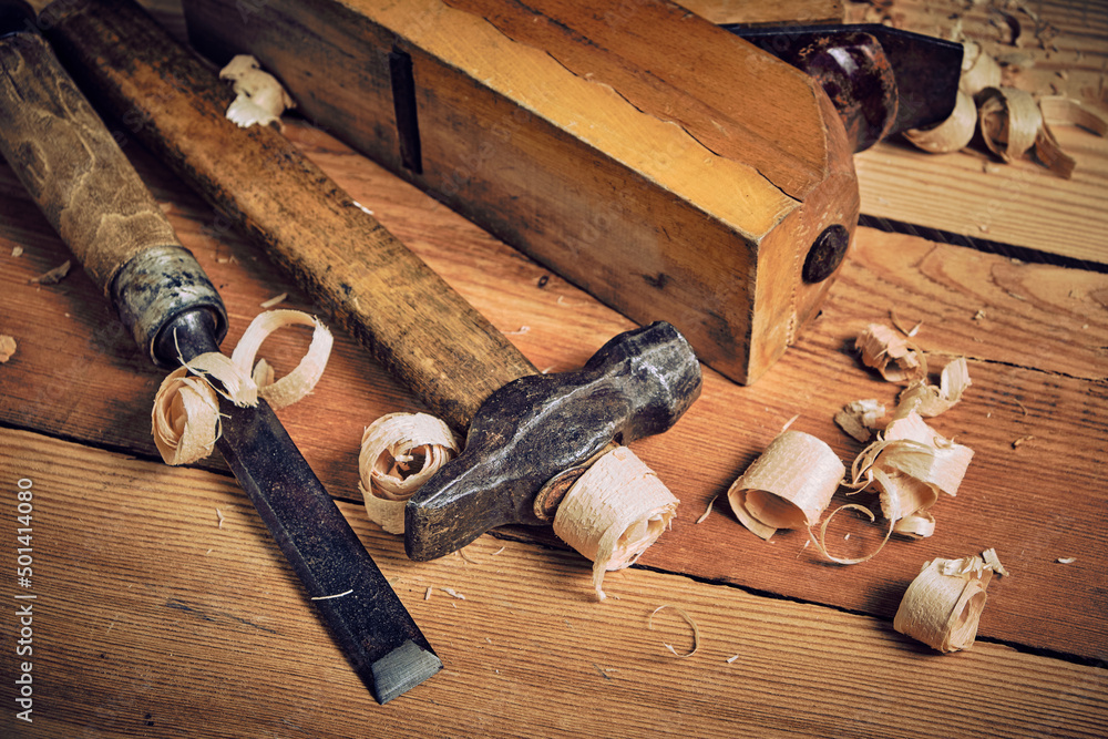 Set of tools for carpenters, hammer, chisel and plane on wooden background.