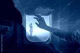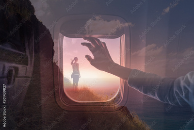 Freedom, and travel adventure. Woman traveling on airplane dreaming of adventure