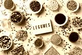 Variety of legumes, lentils, beans, plant based vegan protein source