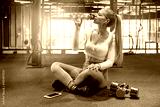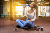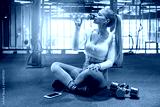 Fitness woman drinking water from bottle while taking a break from workout at gym.