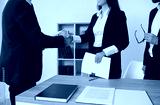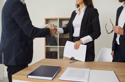 Handshake after successful negotiation of lawyers or consultants with client in office. Cropped image of woman and man in business suits working together with legal contract. Legal concept.