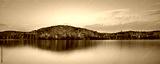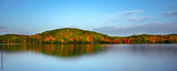 Autumn forest hills on the shore of lake in Gatineau Park, Canada. Reflections in still water. Peaceful autumn scenery