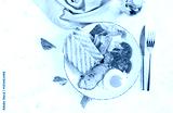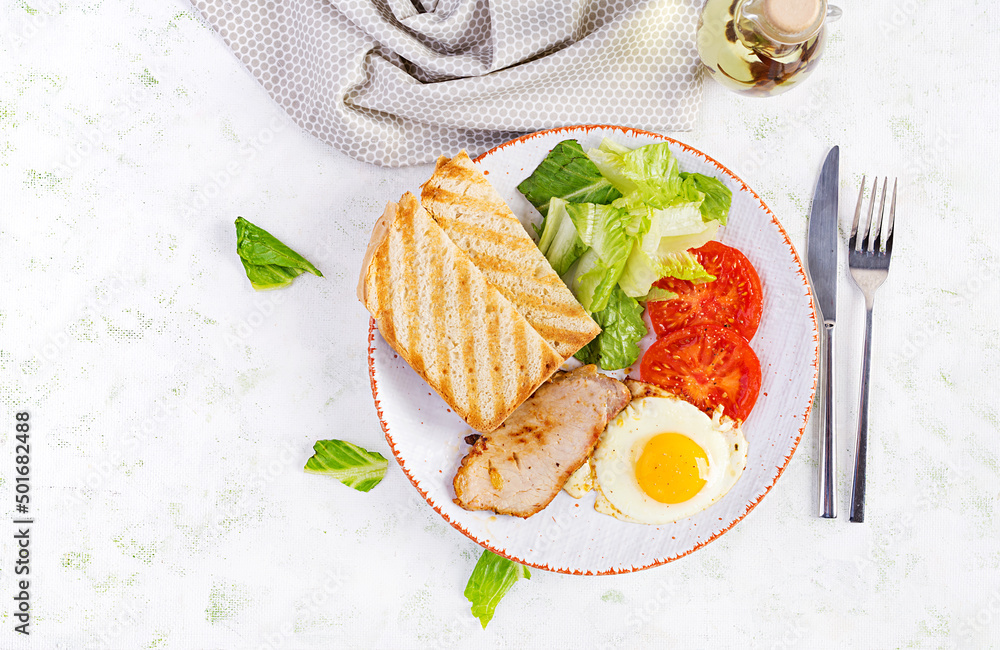 Fried egg with slice pork, tomatoes and toasts. Delicious English Breakfast. Brunch. Top view, overhead