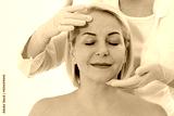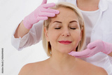 Beautiful Middle Age Woman before Plastic Surgery. Macro Face with Wrinkles and Doctor's Hands isolated on white Background. Anti Aging concept. Mock Up and Copy Space