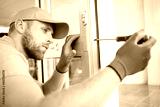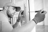 cheerful locksmith installing a door lock
