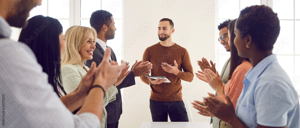 Business team clapping hands after a speaker's presentation in a corporate meeting. Group of happy mixed race people stand up and applaud their colleague thanking him for his report