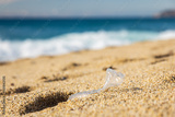Garbage pollution of the planet. Empty plastic bottle on the beach sand. Consequences of human life