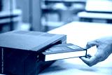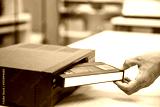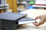 Close-up hand put or insert video cassette tape VHS old retro style on video record playback concept of vintage electric and electronic appliances multimedia player device old fashioned.