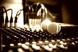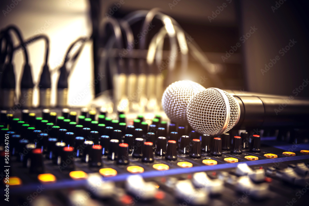 Close-up microphone and sound mixer in studio for sound record control system and audio equipment and music instrument