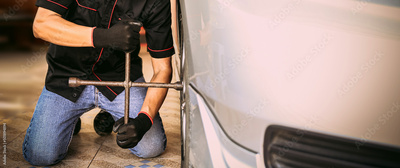 Car care maintenance and servicing, Close-up hand technician auto mechanic using wrench change tire concept of repairing and fix car problem and insurance service support.