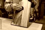 Closeup of Carpenter coating a wooden cutting board with protective flaxseed oil