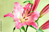 Close-up of pink lily flower on light green background for design on the theme of wedding or holiday invitation