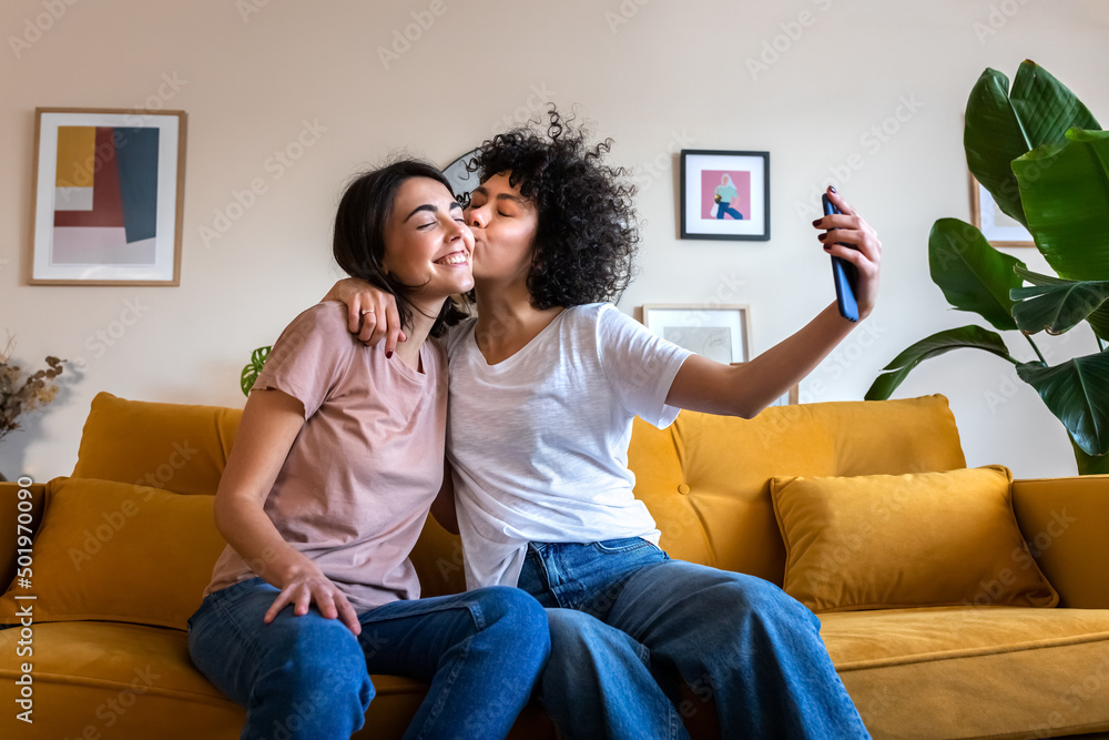 Young lesbian couple taking selfie at home using mobile phone. Girlfriend gives kiss on the cheek.