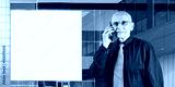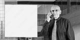 Older businessman wearing eyeglasses talk by phone near office building with empty white advertising banner outdoor