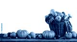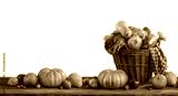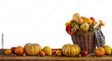 Thanksgiving day pumpkin harvest in wicker basket on white isolated background. Squash, orange vegetable autumn fruit, apples, and nuts on a wooden table. Traditional Halloween decoration fall design