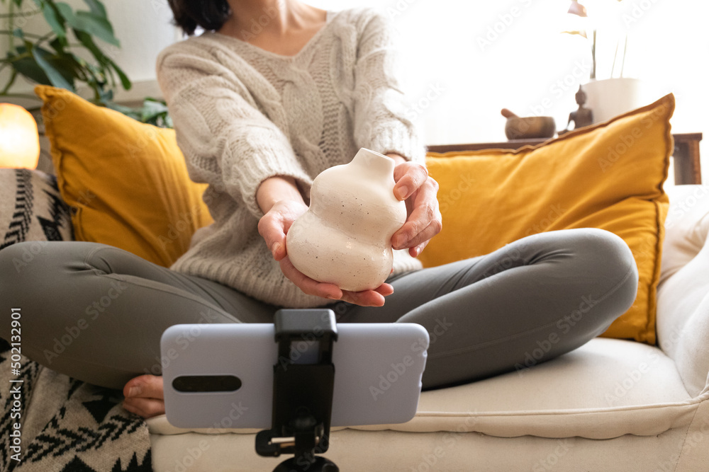 Unrecognizable young woman showing handmade artisan ceramic vase during video call with mobile phone.