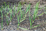 Onion in the garden bed close-up. Cultivation