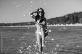 people, summer and swimwear concept - happy smiling woman in bikini swimsuit splashing sea water on beach