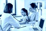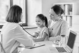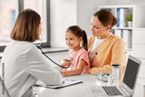 medicine, healthcare and pediatry concept - mother with little daughter and doctor with stethoscope at clinic