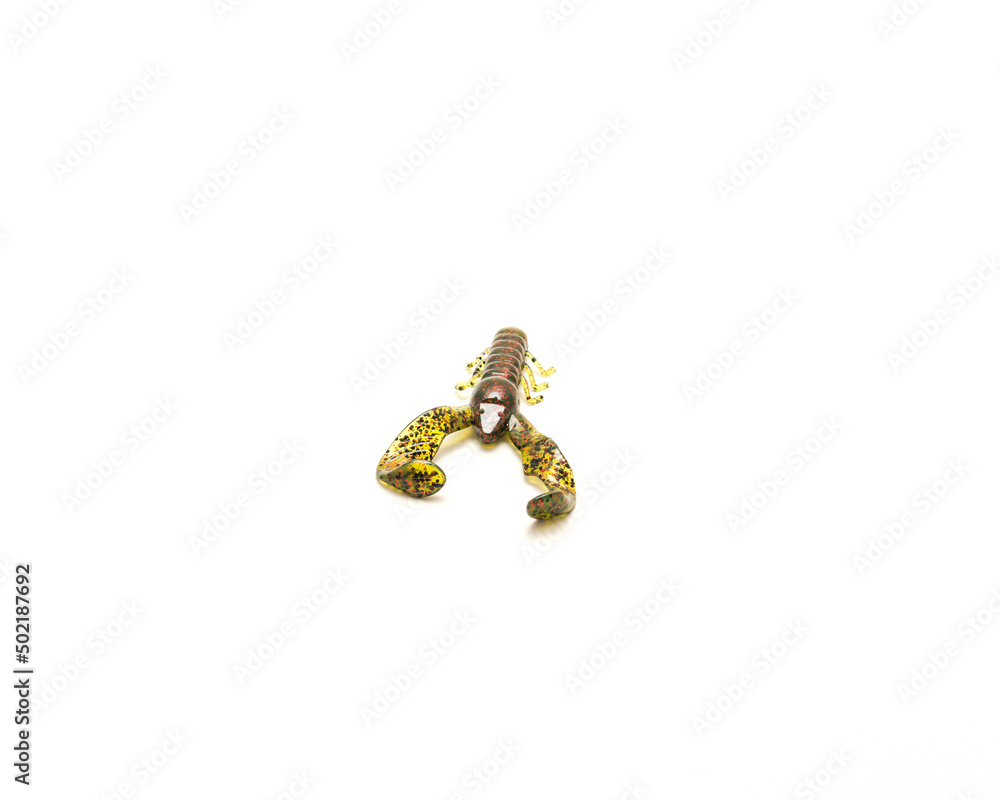 Plastic crawfish or crawdad lure in watermelon with red flake color for flipping and pitching bait bass fishing isolated on white