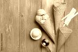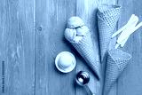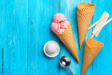 Berry and cream ice cream, waffle cups and a spoon on a blue background. Top view, copy space.