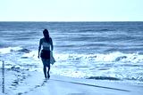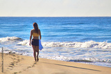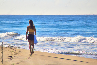 woman walking on the sand with beautiful blue sea in the background in zicatela beach puerto escondido