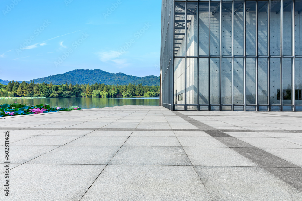 Empty square platform and beautiful lake with mountain natural landscape in Hangzhou, China.