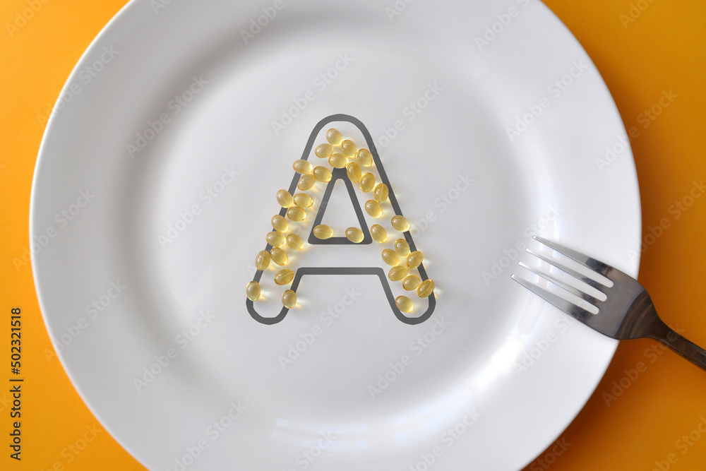 Vitamin A icon from capsules on a plate. Vitamin A deficiency in humans