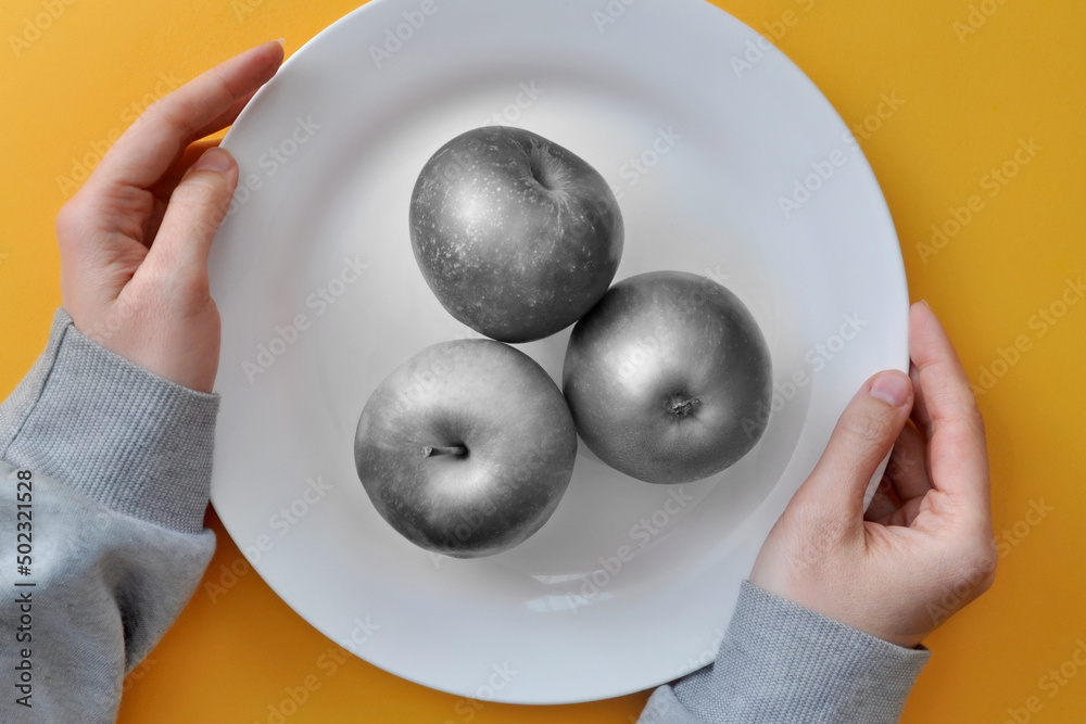 Black and white apples on a plate. Symbol of genetically modified products