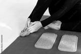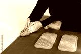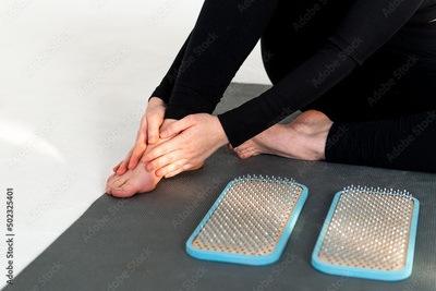 Alternative medicine and mindfulness practice - standing on sadhu board nails barefoot