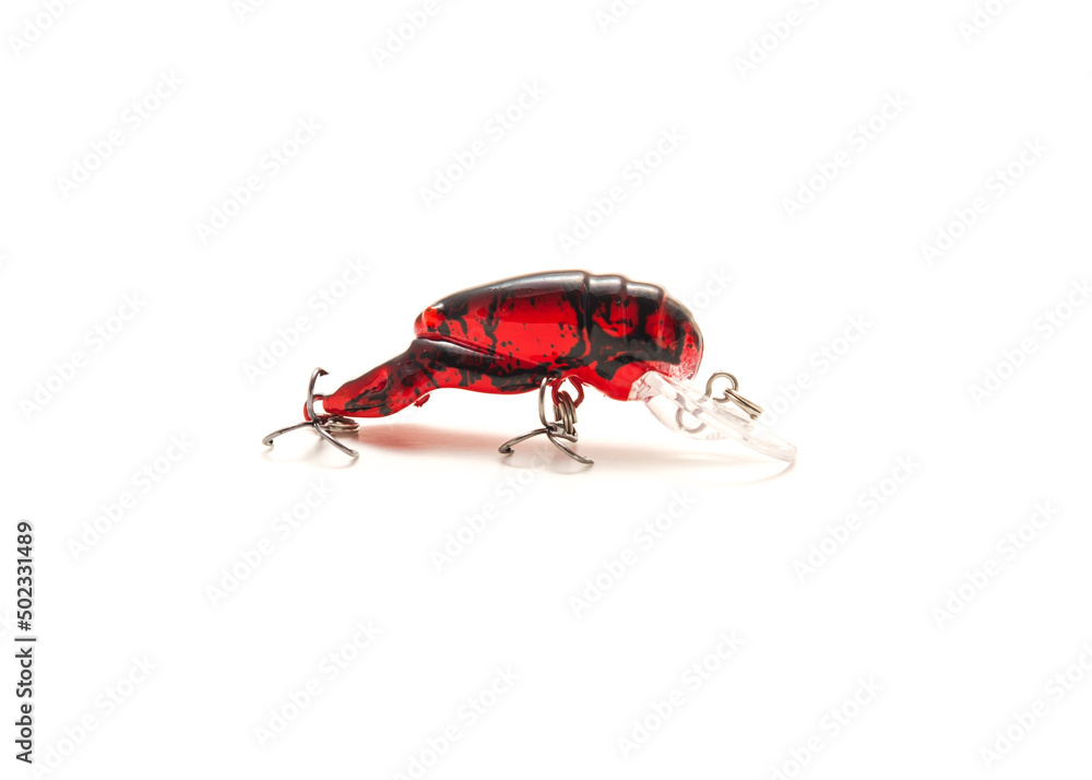 Red crawfish crank bait fishing lure with sharp hooks and vibrant color natural movement isolated on white background