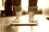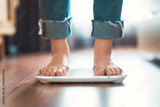 Feet of woman standing on electronic scales for weight control, Female Checking BMI Weight Loss. Barefoot Measuring Body Fat Overweight.