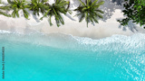 Aerial top view the palm trees in a tropical summer with Soft blue ocean wave on the beach and soft wave background.