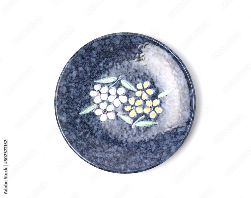 Ceramic plate with beautiful floral pattern isolated on white background.