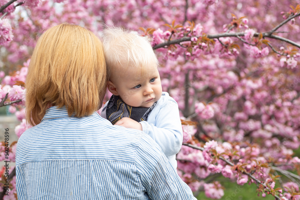 Beautiful woman with little baby boy near pink sakura blooming tree. Spring concept