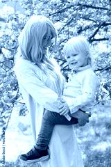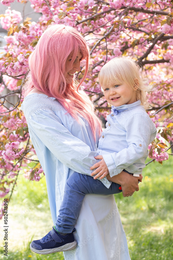 Happy mother mom holding her little baby son boy child under blossoming Sakura Cherry trees with falling pink petals and beautiful flowers