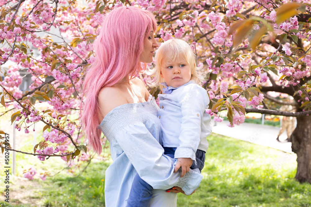Young woman with a child in her arms happy. Sakura blossom in spring Park. Joy of motherhood and child development. Cherry blossom tree in late spring
