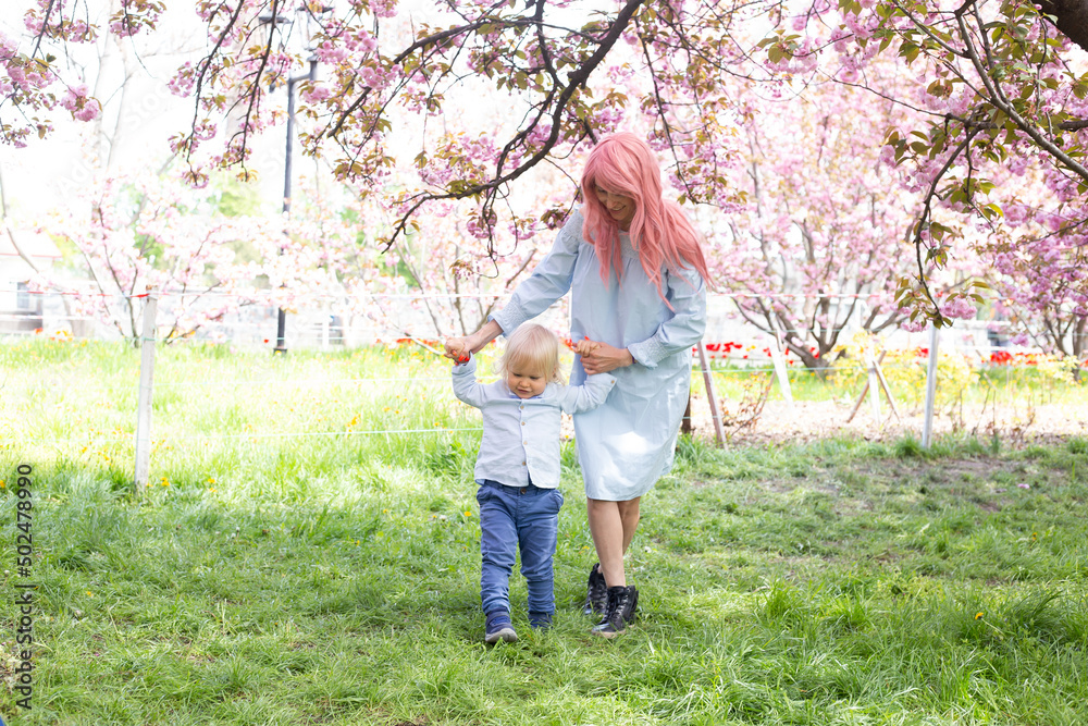 Mom and little son on nature walk at spring park. Little boy and mother have a good time on weekend activity in the blooming Sakura gardens