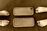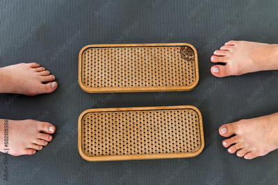 Alternative medicine and mindfulness practice - standing on sadhu board nails barefoot