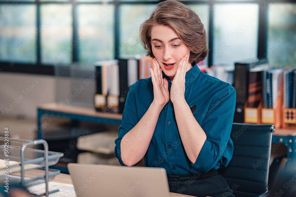 Surprised female looking at laptop screen, sitting at work table, reading good unexpected news in email, message.