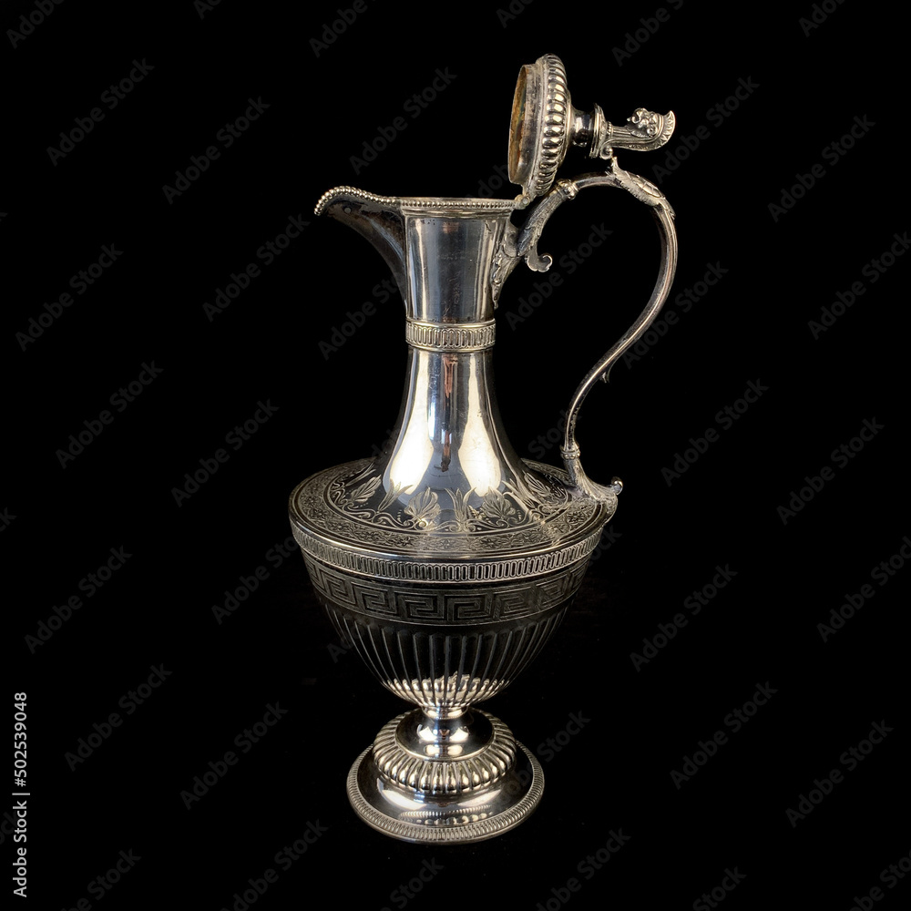 engraved antique silver decanter. vintage metal engraving with floral pattern on black isolated background