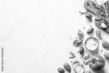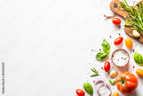 Ingredients for cooking on white stone table. Vegetables, herbs and spices with wooden cutting board. Top view with space for text.
