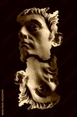 Collage with antique sculpture of human face in surreal style. Modern creative concept image with ancient statue head. Zine culture. Contemporary art poster. Funky punk minimalism. Unusual design.