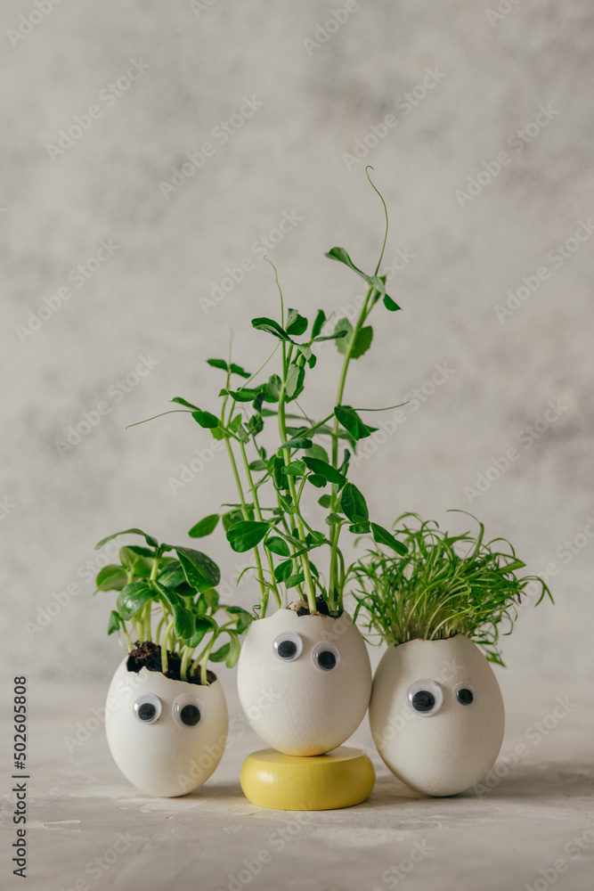 Eggshell with sprouts with toy stickers eyes on the wooden background