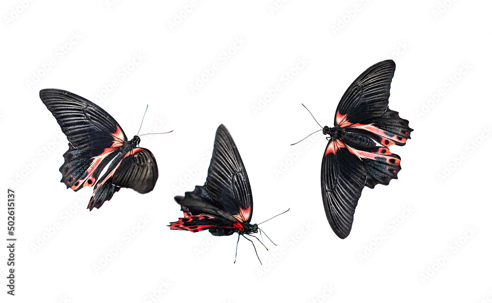 Tropical butterflies Papilio Rumanzovia isolated on white background close up. beautiful black-red Papilio Rumanzovia (Scarlet Mormon) living in Indonesia, Philippines islands. element for design.