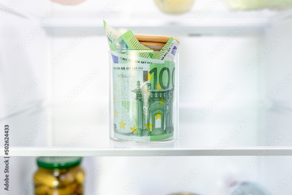 Money, glass jar with euro banknotes in cash in empty home refrigerator. Concept of shadow economy, preservation of finances, freezing of deposits, tax evasion