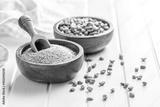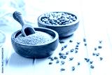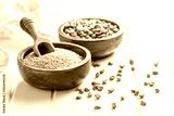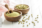 Ground green coffee in a wooden bowl and unroasted coffee beans.