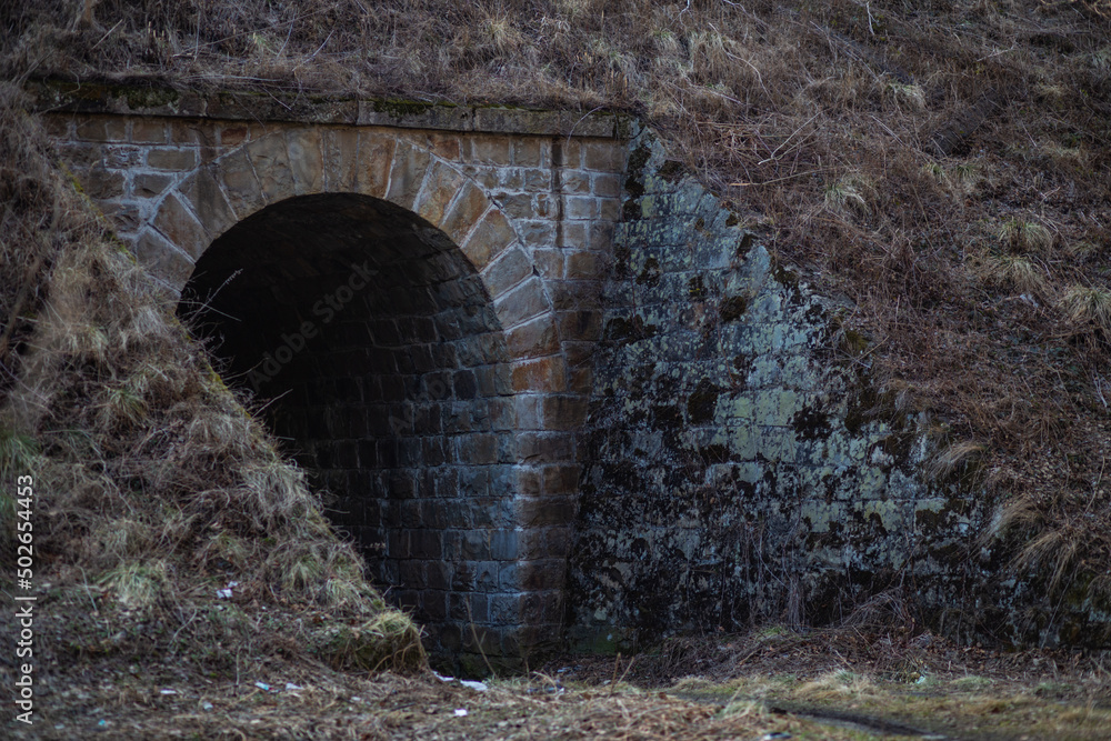 old brick brick tunnel under the mountain slope without grass bricks overgrown with moss looks beautiful and mystical photo